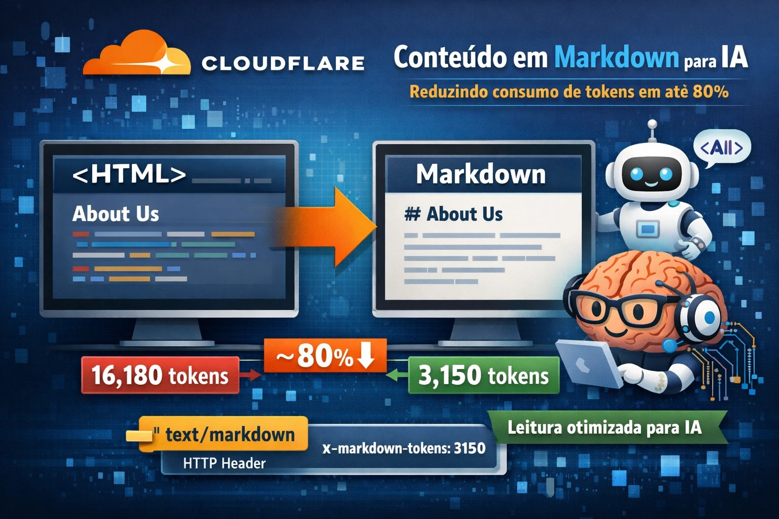 A Cloudflare converte páginas HTML em Markdown para crawlers de IA que solicitam o formato via cabeçalho HTTP Accept com 'text/markdown', reduzindo ruído de tags desnecessárias.. Um post de blog da Cloudflare foi reduzido de 16.180 tokens em HTML para 3.150 em Markdown, representando cerca de 80% menos consumo.. A funcionalidade inclui o cabeçalho 'x-markdown-tokens' que informa o total de tokens do conteúdo entregue, ajudando IAs com limites de contexto, e aplica-se apenas a páginas HTML.